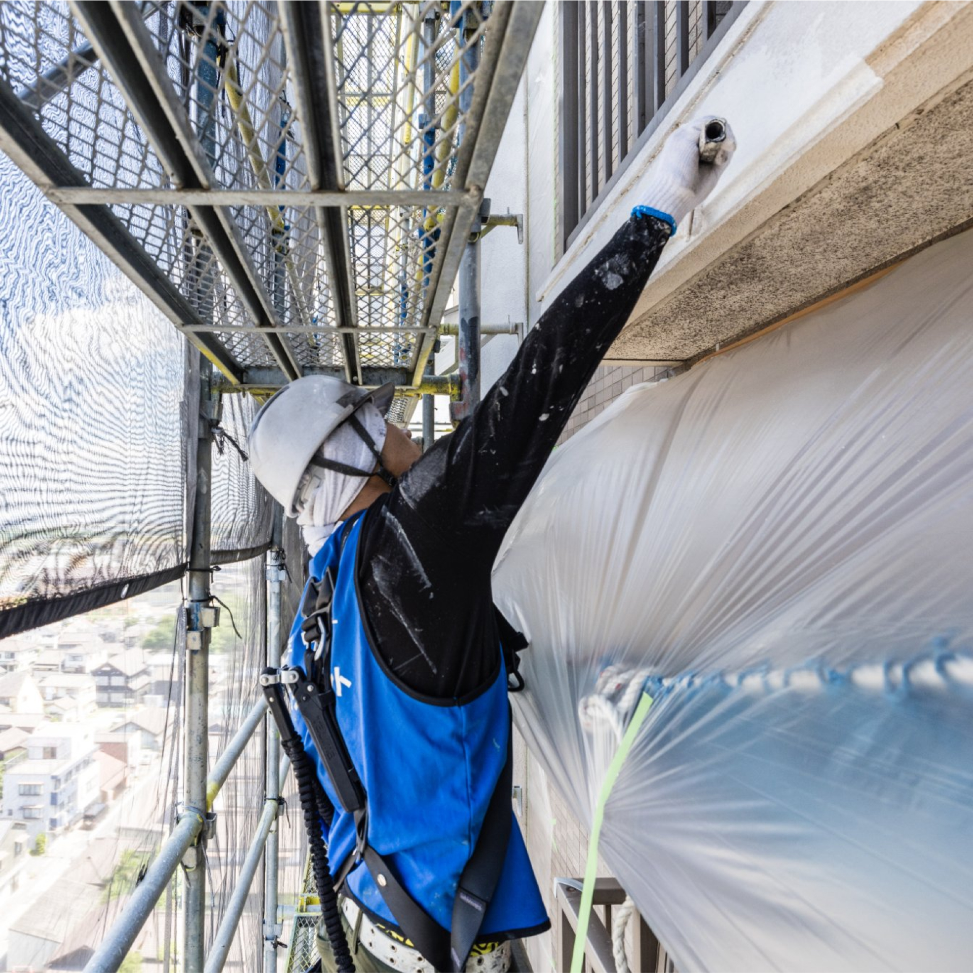 私たちの最大の特長は、改修工事のノウハウを熟知した経験豊富な塗装・防水専門の職人をはじめ、建築士、施工管理技士が正社員として在籍していることです。